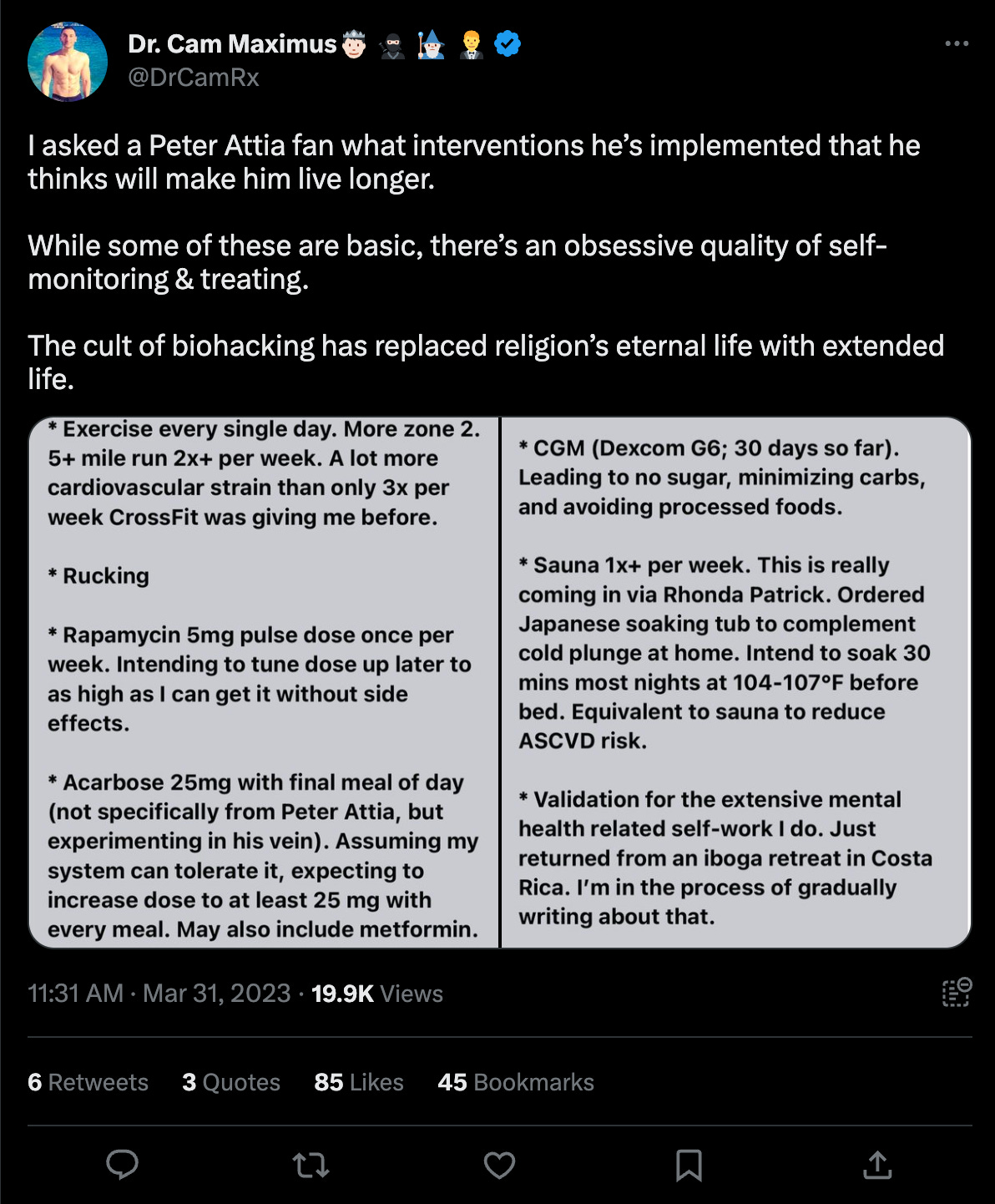 It’s not entirely fair to bucket the entire longevity community together in this. I’ve learned a lot from Attia and Huberman. They emphasize exercise, diet, and sleep, and put out great and honest work.