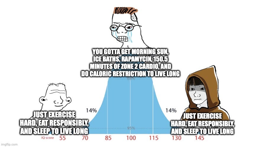 The popular longevity community is creating a bunch of midwits. They promote quick hacks and protocols and prescription drugs that will help us live longer and perform better more than they talk about exercise, diet, and sleep.