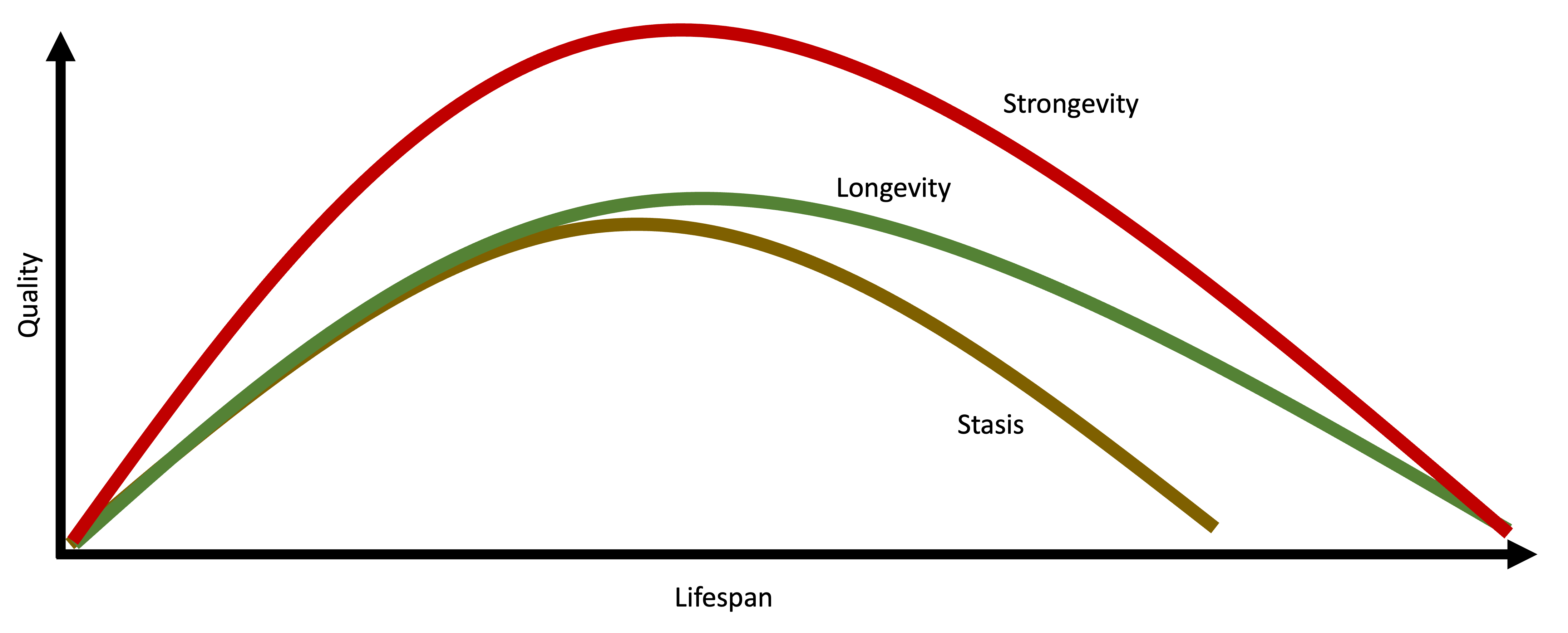 Training for longevity can yield a longer life than those who do nothing. Training for strongevity yields higher peaks when young and old, ending in the same place as those who train for mere longevity.